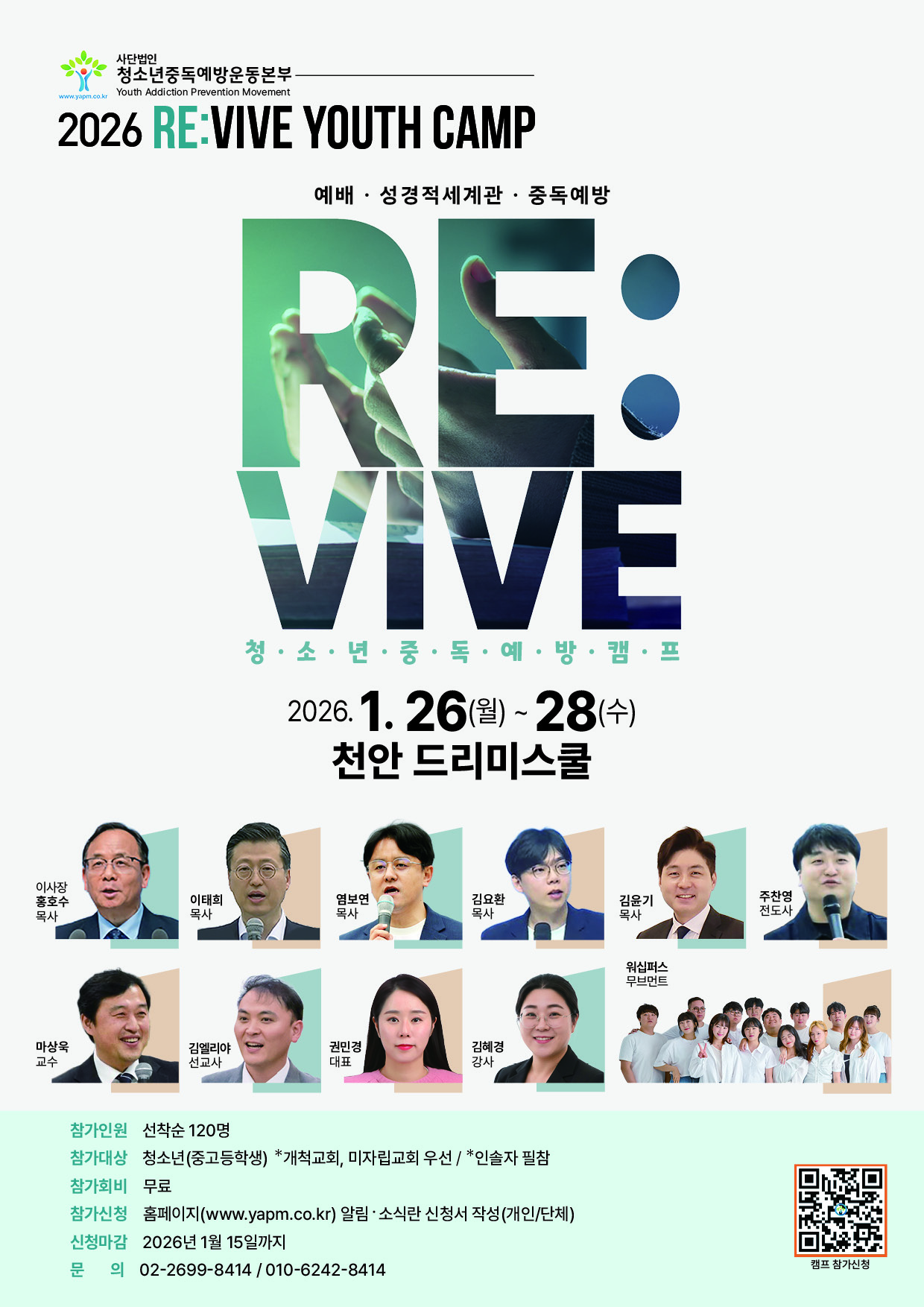 오늘날 청소년들은 스마트폰, 게임, 알코올, 흡연, 마약, 성 중독 등 다양한 환경 속에서 쉽게 마음이 지치고 흔들리곤 합니다. ‘RE:VIVE’는 그런 청소년들이 말씀과 예배로 다시 살아나는 회복의 은혜, 그리고 성경적 가치관으로 삶의 기준을 세우는 시간을 의미합니다.